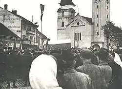 ![]() shora Kostel Navštívení Panny Marie (Považská Bystrica), pohled z Milochova, Považský hrad | |