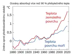 Je velmi pravděpodobné, že se globální průměrná teplota povrchu moře mezi obdobími 1850–1900 a 2011–2020 zvýšila o 0,88 °C v důsledku globálního oteplování, přičemž k většině tohoto oteplení (0,60 °C) došlo mezi lety 1980 a 2020.[4] Teplota povrchu pevniny se zvýšila rychleji než teplota oceánu, protože oceán absorbuje přibližně 92 % přebytečného tepla vzniklého v důsledku změny klimatu.[5]