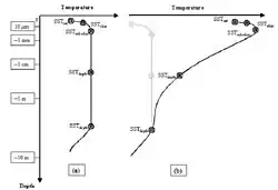 Existuje řada technik měření teploty povrchových vod, které mohou potenciálně přinést různé výsledky, protože se ve skutečnosti měří různé věci. Mimo bezprostřední mořskou hladinu jsou obecná měření teploty doprovázena odkazem na konkrétní hloubku měření. Důvodem jsou značné rozdíly, které se vyskytují mezi měřeními prováděnými v různých hloubkách, zejména během dne, kdy nízká rychlost větru a vysoká intenzita slunečního svitu mohou vést k vytvoření teplé vrstvy u hladiny oceánu a silným vertikálním teplotním gradientům (denní termoklina).[9] Měření teploty mořské hladiny se omezuje na horní část oceánu, známou jako přípovrchová vrstva.[25]
