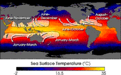 Příznakem El Niño v průběhu teploty povrchu moře je, když se teplá voda šíří ze západního Pacifiku a Indického oceánu do východního Pacifiku. Ta s sebou strhává déšť, což způsobuje rozsáhlé sucho v západním Pacifiku a srážky v normálně suchém východním Pacifiku. Příliv teplé tropické vody chudé na živiny, kterou El Niño ohřívá při svém průchodu rovníkovým proudem na východ, nahrazuje studenou povrchovou vodu Humboldtova proudu bohatou na živiny. Když podmínky El Niño trvají mnoho měsíců, rozsáhlé oteplení oceánu a snížení východních pasátových větrů omezuje příliv studené hluboké vody bohaté na živiny a jeho ekonomický dopad na místní rybolov pro mezinárodní trh může být vážný.[24]