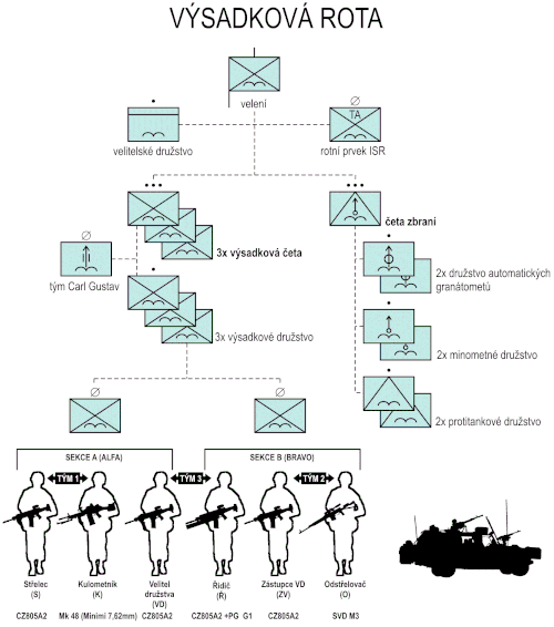 Výsadkovou četu tvoří tři družstva a „tým Carl Gustav“ (obsluha bezzákluzové protitankové zbraně).