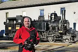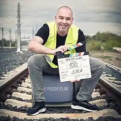 Jiří Dlabaja, autor a moderátor TV magazínu POZOR VLAKTitulní fotografie s Jiřím Dlabajou pro časopis REPORTÉR u příležitosti 100. vydání TV magazínu POZOR VLAK
