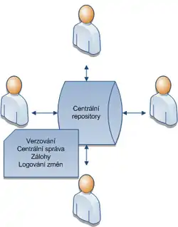 - Z výše uvedeného diagramu vyplývá hlavní výhoda centrálního úložiště zdrojových kódů: