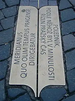 Pražský poledník (zhruba 14°25′17″ východní délky) prochází Staroměstským náměstím v Praze. Historicky byl definován stínem Mariánského sloupu v pravé poledne.[1] Gnómón ale zpravidla obsahuje hrot či jinou ostrou linii, takže Mariánský sloup nemohl sloužit k přesnému určování času či poledne.