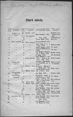 - ↑ HUSÁK, František. Malý schematismus, čili, Seznam ulic a náměstí král. hlavního města Prahy. Praha: vl. nákl., 1870. 227 s. Dostupné online.