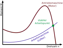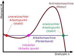- v pracovním bodě je hnací moment a moment zátěže v rovnováze, takže otáčky se nemění; změna otáček v pracovním bodě okamžitě způsobí změnu točivého momentu, který působí proti změně otáček.
