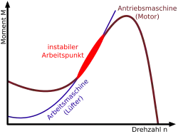 Prostřední stav na Obrázku 3 vpravo je také nestabilní. Těmto stavům se často říká nestabilní pracovní bod, ale výše uvedené předpoklady o pracovním bodě zde neplatí. V tomto případě jsou otáčky a krouticí moment stejně velké, ale v tomto bodě krouticí moment hnacího motoru je okamžitě vyšší než moment zátěže poháněného stroje, když se otáčky poněkud zvýší, a obráceně, když se otáčky sníží. Kvůli tomu nedochází k stabilizačnímu účinku pracovního bodu na otáčky. Otáčky mohou „ujet“ oběma směry, takže soustrojí se dostane buď do pracovního bodu vlevo nebo vpravo.