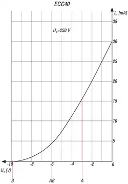Charakteristika elektronky má v bodě, kde začíná téct anodový proud zakřivení (nižší strmost), které způsobuje zkreslení signálu v blízkosti průchodu nulou. Toto vstupní zkreslení zesilovače třídy B lze snížit výběrem pracovního bodu s mírně větším anodovým proudem. Maximální výkon bude mírně nižší (budicí proud Imax / klidový proud Ir ≈ 5).