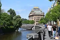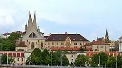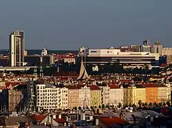 V popředí je řada secesních domů na levé straně zakončená Tančícím domem na nábřeží Vltavy. Za ní uprostřed obrázku je dvojvěž Emauzského kláštera a vpravo Kongresové centrum