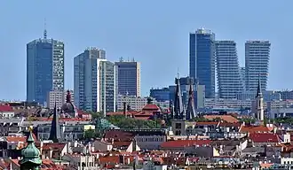 Historické jádro Prahy Po směru hodinových ručiček počínaje obrázkem nahoře: Pražský hrad, výškové budovy na Pankráci, Malá Strana, Staroměstské náměstí, Karlův most, Národní divadlo