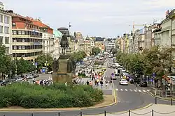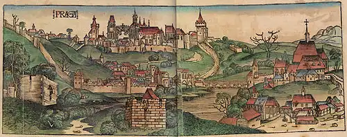 Počátkem 12. století byla Praha kvetoucím městem, nad nímž se vznosně vypínal knížecí Hrad. „Tam žijí Židé mající plno zlata a stříbra, tam jsou ze všech národů nejbohatší kupci, tam jsou nejzámožnější peněžníci, tam stojí tržiště a něm plno kořisti…“, lákala krále podle kronikáře Kosmy kněžna Vipirka.[33] Kupec Ibráhím ibn Jákúb napsal již v 10. století o Praze, že je to „město z kamene“, což bylo ve své době znakem spíše bohatých měst. Tehdejší Praha se rozkládala na území dnešního Starého Města. Pojmenování Starší – respektive latinsky Maior, to znamená také Větší – Město pražské získala poté, co Přemysl II. Otakar udělil roku 1257 magdeburská městská práva pražskému podhradí, osídlenému již minimálně od 10. století. Tak vzniklo Menší Město pražské – Malá Strana. Příliv řemeslníků a kupců do obou měst sílil, zvláště když se v době panování Karla IV. Praha stala císařskou residencí a císař zamýšlel učinit z ní hlavní město Svaté říše římské. Prostor vymezený hradbami pražských měst však začal být pro početné příchozí brzy příliš těsný, a tak panovník přistoupil k velkorysému podniku – v roce 1348 založil Nové Město pražské a vytyčil pro ně rozsáhlé území rozprostírající se mezi Vyšehradem, Poříčím a Starým Městem. To bylo postupně zaplňováno měšťanskými domy, prostornými tržišti, zahradami, nádhernými stavbami kostelů a klášterů. Velikostí a nádherou mohla Praha této doby soupeřit s nejslavnějšími městy Římem, Florencií, Paříží, Kolínem, napsal o sídelním městě Karla IV. František Palacký. V době Karlově ovšem byla většina jím založených kostelů jen rozestavěna. Bohatým italským městům jako Řím, Florencie, Benátky se nemohla rovnat.[34][35][36][37][38][39] Tehdy Praha sice patřila mezi největší města v Evropě a stala se rozlohou třetím největším v celé Svaté říši římské,[40] ale počet obyvatel Prahy byl tehdy ovšem menší než v Římě, Benátkách, Janově, Florencii, Miláně, Cařihradu, Paříži či Londýně.[34][35][36][37][38][39]