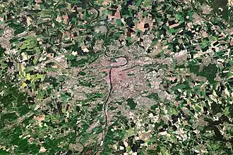 Panorama Prahy z Petřínské rozhledny. Vlevo jsou vidět Hradčany s Pražským hradem, jemuž dominuje svatovítská katedrála, pod nimi se rozkládá Malá Strana s chrámem sv. Mikuláše a věží Pražského Jezulátka. Ve středu snímku záhyb Vltavy překlenutý (zprava) Karlovým, Mánesovým a Čechovým mostem obtéká Staré Město. U horizontu leží Severní Město, Letná a Holešovice, Karlín, Vinohrady, Nové Město, Žižkov, Pankrác, Podolí i další čtvrti a Žižkovský vysílač.