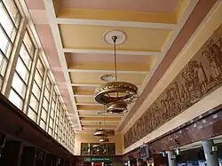 Původní odbavovací budova z 19. století ležela severněji (příjezdová budova byla na sever od lávky).[5] V letech 1953 až 1956 byla zbořena a nahrazena funkcionalistickou budovou, kterou navrhli architekti Jan Zázvorka starší a Jan Žák. Výrazný prvek výzdoby odbavovací haly tvoří budovatelská freska Richarda Wiesnera. K dalším úpravám došlo roku 1985 při napojení na pražské metro. Tehdy byla kolem hlavní odbavovací haly přistavěna přízemní budova a došlo tak k rozšíření vnitřního prostoru.
