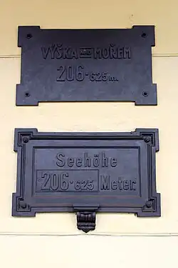 Dvojjazyčné informační tabulky v českém a německém jazyce z doby společné monarchie s informací o nadmořské výšce