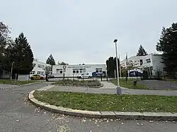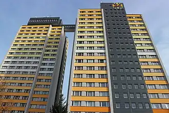 ![]() Výšková budova Ubytovna Kupa a modrá škola u stanice metra Háje – jednoho z přirozených center Prahy 11. | |
