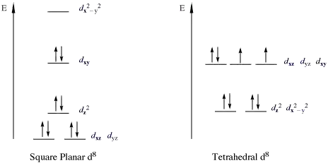 Níže je zobrazeno rozštěpení d podslupek u nízkospinových čtvercově rovinných komplexů: