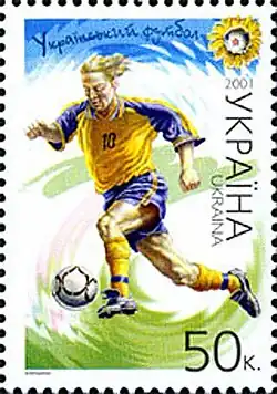 Ukrajinská poštovní známka s fotbalovou tematikou z roku 2001