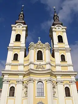 Komplexu kláštera dominuje stavba Kostela svatého Jana Křtitele. Čtyřpodlažní průčelí kostela je členěno horizontálními římsami. Na okrajích je zvýšeno o jedno podlaží a přechází do dvojice štíhlých věží ukončených helmicemi. Dvě spodní patra průčelí jsou vertikálně členěna pilastry zakončenými hlavicemi v korintském slohu. Jeho centrální část s hlavním portálem, konvexně-konkávní rizalit, je na vrchu ukončena trojúhelníkovým tympanonem se symbolem Nejsvětější Trojice. Okraje stavby obsahují mělké, oválně zakončené niky, v nichž stojí sochy dvou uherských králů – světců: svatého Ladislava a svatého Štěpána.
