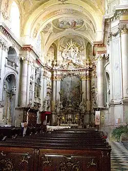 Pod hlavní klenbou jsou umístěny dva oltáře, vlevo zakladatele premonstrátského řehole svatého Norberta, vpravo svatého Augustina, charakteristické monumentální apoteózou obou světců. Myšlenkový odkaz obou kompozic poukazuje na vítězství křesťanské víry nad pohanstvím.