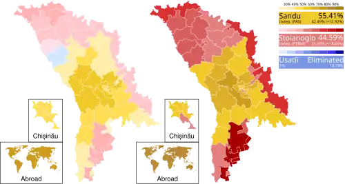 Vítězové v okresech a sektorů Kišiněva v 1. kole (vlevo) a 2. kole (vpravo) | |||||||||||||||||||||||||||||||||||||||||||