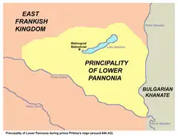 Na počátku 40. let 9. století, snad přímo roku 840 (či 842), obdržel Pribina od Ludvíka II. Němce jako beneficium část Dolní Panonie kolem řeky Zaly západně od Blatenského jezera. Postupně se toto území vyvinulo v jakési franské klientské knížectví pod Pribinovou vládou. Brzy po získání území začal s výstavbou nového centra zvaného Mosapurc či Blatnograd.[pozn. 1][4]