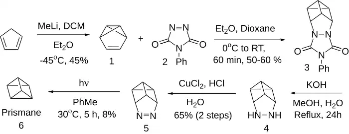 Příprava prismanu začíná u benzvalenu (1), který v postupné reakci Dielsova-Alderova typu reaguje se silným dienofilem 4-fenyl-1,2,4-triazol-3,5-dionem (2) za vzniku karbokationtového meziproduktu, jenž vytvoří adukt (3), který je poté v zásaditém prostředí hydrolyzován a po reakci produktu hydrolýzy s chloridem měďnatým v kyselém prostředí a následné neutralizaci silnou zásadou se vytváří azosloučenina (5), kterou lze krystalizovat se 65% výtěžností; posledním krokem je fotolýza této azosloučeniny na biradikál, který se přeměňuje na prisman (6) a plynný dusík. Izolaci prismanu lze provést s využitím plynové chromatografie.