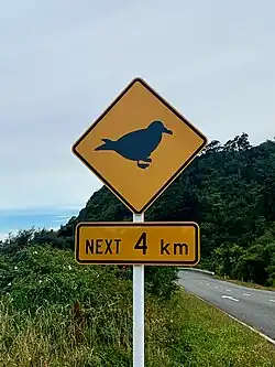 Dopravní značka u Punakaiki upozorňující na možnou přítomnost buřňáků novozélandských na silnici