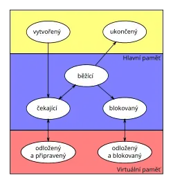 - odložený a čekající (suspend waiting) – v systémech, které podporují virtuální paměť, mohou být procesy odsunuty z hlavní paměti a umístěny do virtuální; odtud pak může být proces přesunut zpátky do stavu čekající