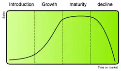 - Úpadek (Decline)– postupné stažení výrobku z trhu a jeho náhrada novým výrobkem. Pokles prodeje je buď rychlý nebo pomalý z důvodu technologického pokroku, přesunu zákaznických zájmů, zvýšení domácí či zahraniční konkurence. Zvýšený marketing bude mít malý účinek na prodeje a nebude nákladově výhodný, pokud se neidentifikují nové trhy. Firma se snaží revidovat marketingové strategie: uvažuje, co s výrobky. Je třeba nejprve identifikovat slabé výrobky a poté uplatnit jednu z možných strategií.[6]