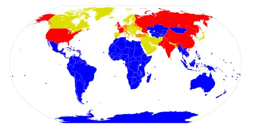 Je známo, že ze tří jaderných mocností v NATO (Francie, Spojené království a Spojené státy) poskytly zbraně pro sdílení jaderných zbraní pouze Spojené státy. Od listopadu 2009 Belgie, Německo, Itálie, Nizozemsko a Turecko hostí americké jaderné zbraně jako součást politiky NATO pro sdílení jaderných zbraní.[3][4] Kanada hostila zbraně pod kontrolou North American Aerospace Defense Command (NORAD), spíše než NATO, až do roku 1984, a Řecko až do roku 2001.[3][5][6] Spojené království také obdrželo do roku 1992 americké taktické jaderné zbraně, jako je jaderné dělostřelectvo a střely Lance, i když je Spojené království samo o sobě státem s jadernými zbraněmi; ty byly nasazeny hlavně v Německu.