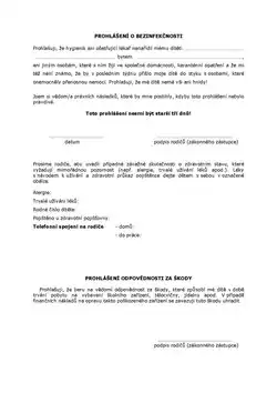Prohlášení o bezinfekčnosti je zvláštní formou čestného prohlášení, které je vyplňováno zákonnými zástupci dítěte, před jeho odjezdem např. na: školu v přírodě, táborový pobyt pro děti apod. Tímto prohlášením se zákonní zástupci dítěte zavazují, že dítě netrpí žádným onemocněním, kterým by mohlo ohrozit ostatní děti ve skupině.