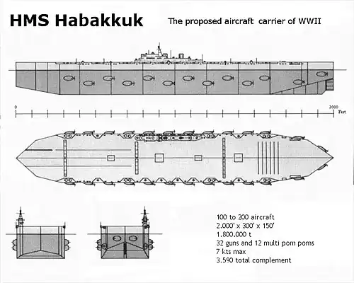 Plavidlo mělo být dlouhé 600 metrů, široké 90 metrů a vysoké 60 metrů. Na plavidlo se mělo uskladnit až 200 stíhaček Spitfire nebo 100 stíhacích bombardérů Mosquito, společně s veškerým servisním zařízením obvyklým na letadlové lodi. Loď měla dosahovat rychlosti pouhých sedm uzlů, při spotřebě 120 tun paliva za den. Osádku plavidla mělo tvořit přibližně 3 500 námořníků.