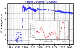 Hvězda typu FU Orionis (také FU Orionis objekt nebo FUor ) je mladá hvězda před hlavní posloupností, která vykazuje extrémní změnu jasu a spektrálního typu. Jedním z příkladů je hvězda V1057 Cyg, která se v letech 1969-1970 zjasnila o 6 magnitud a přešla ze spektrálního typu dKe na veleobra typu F. Tyto hvězdy jsou pojmenovány po své typové hvězdě, FU Orionis . Současný model, který vyvinuli především Lee Hartmann a Scott Jay Kenyon vysvětluje vzplanutí FU Orionis náhlým přenosem hmoty z akrečního disku na mladou hvězdu T Tauri o nízké hmotnosti.[3][4] Rychlost přenosu hmoty je pro tyto objekty odhadována na přibližně 10−4 hmotností Slunce za rok. Doba, za kterou dojde ke zvýšení jasu, je obvykle řádově 1 rok, ale může být mnohem delší. Doba trvání fáze s vysokou akrecí a vysokou svítivostí je v řádu desítek let, přesto dosud (do roku 2015) nebyl pozorován žádný objekt FU Orionis, u něhož by nastal výrazný pokles jasu. Je odhadováno, že průměrná mladá hvězda během svého života projde přibližně 10–20krát fází FUor.