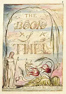 - The Book of Thel (1789–1790, Kniha Thel), obsahem knihy je konflikt mezi nevinností a zkušeností zobrazený pomocí reflexe dívky na prahu dospělosti, která se obává ztráty nevinnosti a panenství při vstupu do světa sexuality dospělých, což jí brání ve skutečném životě. Dívka Thel naříká nad problémy života, ale konvalinka, oblak, červík a hrouda jí tvrdí, že všichni mohou dojít blaženosti ve všeobjímající lásce a nesobeckosti. Všechno zlo pochází ze „stříbrné metly“ autority, která drží na uzdě nevinné tužby tím, že uzavírá lásku do „zlaté číše“ mravnostních předpisů.[2]