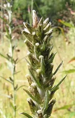 Až 60 cm vysoká, vytrvalá, šedoplstnatá rostlina rostoucí z rozvětveného oddenku. Společně s přímými nebo poléhavými a vystoupavými květnými lodyhami vyrůstají i mnohé nekvetoucí výběžky. Lodyha je hustě porostlá listy které jsou na líci lysé a na rubu šedoplstnaté a mají výraznou střední žilku. Celokrajné listy s krátkým řapíkem jsou podlouhle kopinaté, spodní jsou až 10 cm dlouhé a jen do 1 cm široké. Po lodyze směrem vzhůru jsou stále kratší a užší, až přejdou v čárkovité listeny.