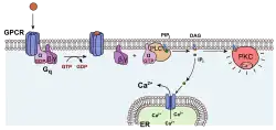PKC je v typickém případě aktivována tak, že nejprve dojde (díky IP3) ke vzrůstu koncentrace vápenatých iontů, což vede k tomu, že PKC se asociuje s vnitřní stranou membrány a aktivuje se. Dostává se do kontaktu s membránovým lipidem DAG, který byl vytvořen pomocí fosfolipázy C obvykle na popud nějakého receptoru spřaženého s G-proteinem (někdy však zřejmě přes PI3K kinázu).[2]