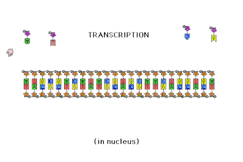 Pro průběh transkripce je důležitý enzym RNA polymeráza, který je schopný podle vzoru DNA vyrábět kopie v podobě mRNA . Nejdříve se rozplete část dvoušroubovice DNA, která se skládá z jednotlivých kódujících genů. Enzym RNA polymeráza se naváže na začátek genu a začne na nukleotidy DNA připojovat komplementární nukleotidy mRNA. Když se do mRNA přepíše celý gen, jednořetězcová lineární molekula RNA se odpojí a putuje k ribozomu, kde z ní v procesu translace vzniká bílkovina.