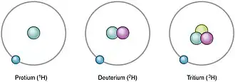 Tři izotopy vodíku s protonovým číslem 1: * Protium obsahuje jeden proton a jeden elektron * Deuterium jeden proton, jeden neutron a jeden elektron * Tritium jeden proton, dva neutrony a jeden elektron Neutronové číslo (N) – je počet neutronů v jádře atomu. Neutronovým číslem se liší různé izotopy jednoho prvku.