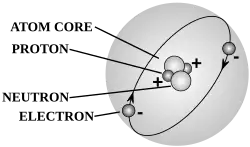 Struktura atomu obecně. Zde atomové jádro (atom core) obsahuje dva protony a dva neutrony, elektronový obal obsahuje dva elektrony.