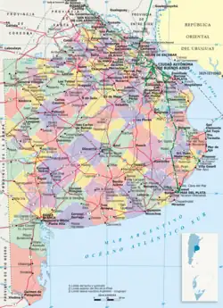 Provincie se dělí na 135 územních celků, zvaných partidos (administrativní centra jsou v závorce). Ty jsou na úrovni okresu a v zásadě odpovídají departementům v ostatních argentinských provinciích. Oproti nim jsou však zároveň nejnižšími samosprávnými jednotkami na úrovni obce. Sice se dělí na čtvrtě (localidas), z nichž některé mají status města, ty však nemají vlastní samosprávu a jsou spíše administrativního charakteru.