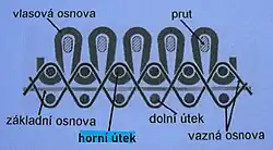 Tři systémy osnovních nití navinuté na válech: vlasová, vazná a základní (výplňková) osnova.