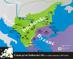 Čtyři bratři, kteří si udrželi vládu v západních částech Bulharska, si posléze správu území rozdělili mezi sebe. V následujících letech postupně tři nejstarší z nich umřeli[pozn. 3] a nejmladší Samuel převzal vládu i na jejich územích. Když roku 976 zemřel i Jan Tzimiskes, oba synové cara Petra unikli z Konstantinopole a pokusili se dostat na bulharské území, přičemž cestu přežil pouze mladší Roman, zatímco Boris II. byl zabit při přechodu hranic bulharskými hlídkami. Protože Roman nebyl schopen zplodit žádné děti, vykonával za něj ve skutečnosti vládu Samuel a po Romanově smrti roku 997 během opětovného zajetí v Konstantinopoli se nechal prohlásit carem.[66] Samuel během své vlády dále rozšiřoval svou moc na území, jež dříve tvořila součást bulharského státu, a Bulharsko se tak během jeho vlády na krátkou dobu opět v rámci Balkánu stalo velmocí. V posledním období říše ovšem vnitřní situace doznala určitých změn, protože centrum kulturního a politického dění se nyní přesunulo do západní části, zejména do Ochridu.[3]
