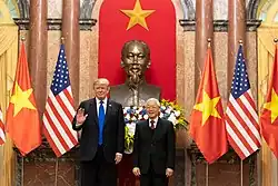 Dne 26. února 2019 přiletěl Trump s početným doprovodem do hlavního města Vietnamu Hanoje, kde se po dva následující dny setkal s vůdcem Severní Koreje Kim Čong-unem. Bylo to druhé jejich setkání po Singapurském summitu v červnu 2018. Přes zčásti přehnaná očekávání ve světě však tato schůzka nepřinesla žádné hmatatelné výsledky. Kim nebyl ochoten přistoupit na úplné odzbrojení severokorejského atomového arzenálu, nýbrž nabízel pouze částečné odzbrojení výměnou za zrušení přísných hospodářských sankcí vůči svému režimu. To však Trump a americká vláda odmítli. Summit skončil o dvě hodiny dříve, než bylo plánováno.[65] Trumpovo rozhodnutí skončit summit bez výsledku zhodnotil vůdce demokratické menšiny v Senátu USA Chuck Schumer pozitivně: „Prezident udělal dobře, že přerušil rozhovory a vzdal se dobré fotografie výměnou za špatný obchod.“[65]