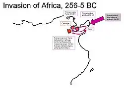Povzbuzeni svými úspěchy na Sicílii pokusili se Římané v letech 256 až 255 př. n. l. o další rozsáhlou vojenskou operaci, tentokrát ovšem s odlišným výsledkem. Římané usilovali o co nejrychlejší konec války a rozhodli se proto k invazi do severní Afriky s cílem ohrozit zdejší kartaginské spojence a přinutit tak Puny k přijetí mírových podmínek. Byla vybudována velká flota skládající se z transportních lodí pro pěchotu a z doprovodných válečných lodí. Kartaginské úsilí zamezit invazi bylo zmařeno jejich porážkou v námořní bitvě u mysu Eknomus. Následně se římské vojsko pod velením konzula Marca Atilia Regula vylodilo v Africe a začalo pustošit kartaginské zázemí. Regulus zpočátku vítězil a poté, co přemohl Puny v bitvě u Adys, žádalo Kartágo o mír. Podmínky stanovené Regulem byly ale natolik tvrdé, že se Kartaginci raději rozhodli pokračovat v boji.