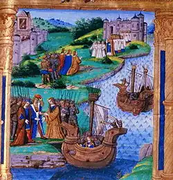 ![]() Vlevo Jan Bezzemek bojuje s francouzskými vojáky, vpravo jede princ Ludvík (středověká iluminace) | |||