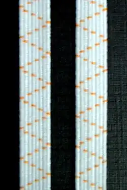 Poznámka: Jádro bungee lan je z přírodní nebo umělé pryže, má podobný tvar jako stříhané fóliové pásky a lano se zhotovuje splétáním. Pásky na bungee lana jsou však asi desetkrát hrubší, mají v průřezu rozměry 2–3mm x 6,5mm (a délku 30 m).[16] Ačkoliv žádné z popsaných kritérií neodporuje příslušným definicím, bungee lana se nikde nepovažují za textilie.
