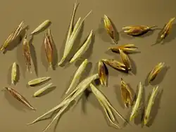 Plod je suchá, medově žlutá podlouhlá obilka (semeno) s jemně průsvitnou pluchou. Štíhlá obilka bývá dlouhá do 2 mm a široká jen 0,5 mm, je velmi lehká a do 1 gramu se jich vejde 12 000 až 20 000.[2][3][4][6][8]