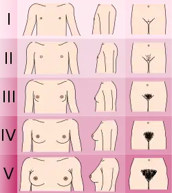 Prvním fyzickým znakem puberty u dívek je obvykle zpevnění bradavky na jednom či obou prsou zhruba mezi desátým a jedenáctým rokem věku. Toto ukazuje na začátek růstu prsou v pubertě. Podle Tannerovy stupnice je to fáze číslo dvě ve vývoji prsou (fáze jedna jsou plochá předpubertální). Během 12 měsíců od této fáze se prsa začínají vzdouvat a začínají být patrná navenek. Toto je fáze tři ve vývoji prsou. Během fáze 4 prsa ještě více mohutní a získávají téměř dospělý tvar, který se ještě ustálí během fáze pět. U některých žen fázi čtyři a pět nelze vůbec rozlišit. Děvčata zažívají také svoji první menstruaci.