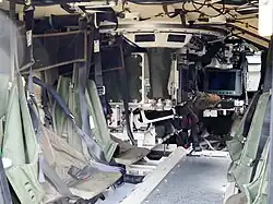 Řidič sedí v přední části korby vlevo a kromě jiného má ve svém prostoru displej, na kterém může sledovat venkovní situaci z vnějšího kamerového systému. Střed a pravou část přídě zabírá pohonná jednotka. Ta je tvořena desetiválcovým motorem MTU 892 nové generace s výkonem 800 kW a plně automatickou šestistupňovou převodovkou. Za řidičem sedí střelec, vedle něj přibližně ve středu podélné osy korby má své stanoviště velitel. Oba mají k dispozici displeje, na kterých mohou sledovat zobrazení ze zaměřovačů ve věži a další informace předávané vozidlovým informačním systémem.