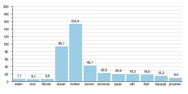 Průměrné měsíční průtoky řeky ve stanici Bogadinskoje v letech 1936 až 1999:[2]
